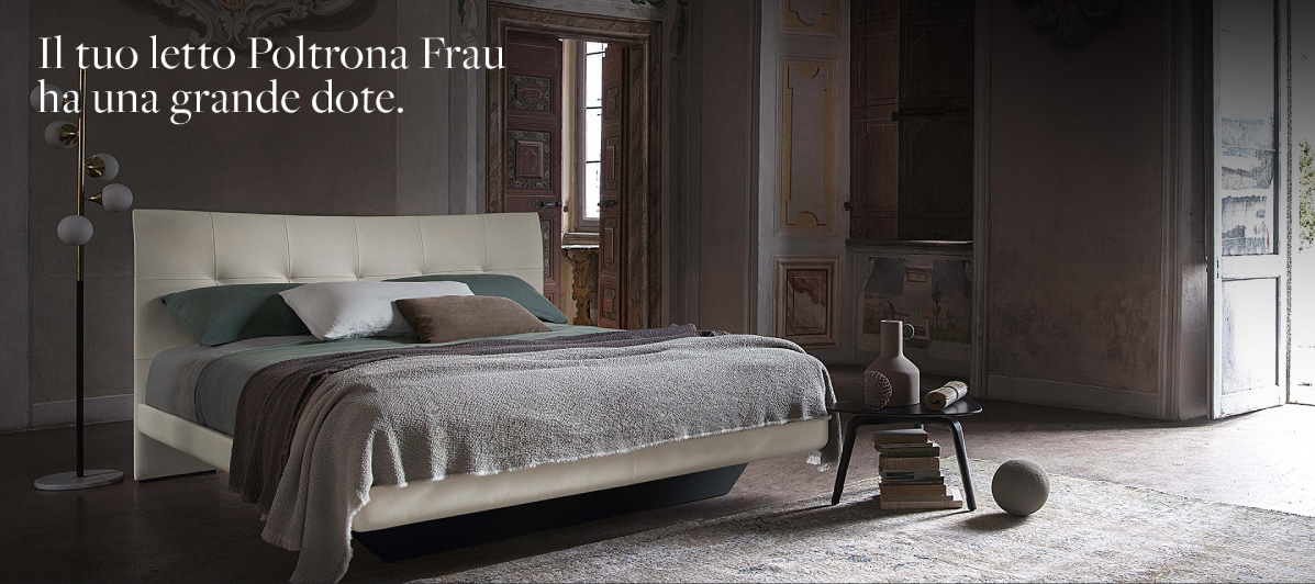 La testata, in faggio con rivestimento in pelle Frau, è ampia e accogliente, impreziosita da una delicata lavorazione a impunture a scansioni regolari, a formare un moderno capitonné che profuma d’800.